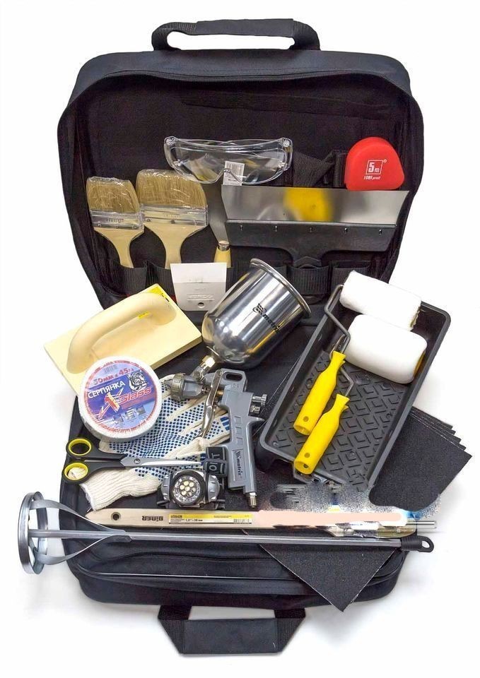 Набор состоит из валиков для покраски и для поклейки обоев, полиуретановой терки, сетки для выравнивания, кистей, краскораспылителя, миксера, защитных очков, шпателей, ножниц и фонаря.