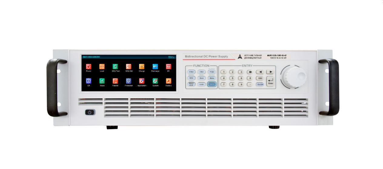 Серия АКИП-1505 представляет собой мощные двунаправленные программируемые источники постоянного тока, объединяющие функции источника питания и регенеративной электронной нагрузки в едином корпусе. Устройство способно как отдавать, так и поглощать ток, обеспечивая гибкость при тестировании разнообразных объектов. Благодаря широкому диапазону выходных параметров и высокой удельной мощности — до 42 кВт в корпусе высотой всего 3U — прибор подходит для широкого спектра задач в области испытаний электронных устройств. Напряжение на выходе регулируется в диапазоне от 0 до 2250 В.